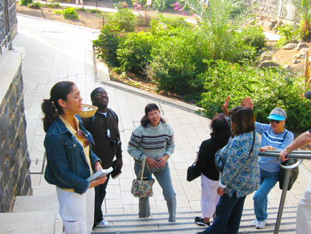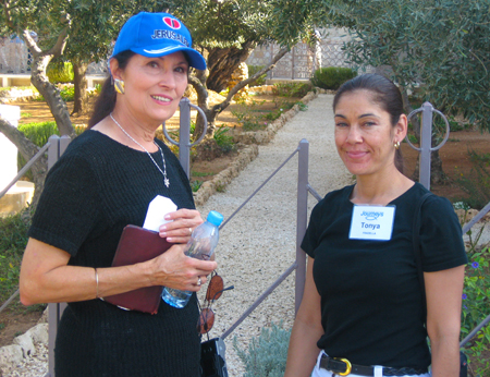 Sis. Judith leading in prayer after sharing a meditation; Mt. of Beatitudes | Garden of Gethsemene - Sis. Judith & Sis. Tonya, UCM Partner |