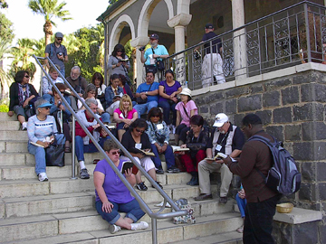 Rev. Shirley Frisbee & Sis. Judith KFAX Host Dion Evans reading scripture, Mount of Beatitudes